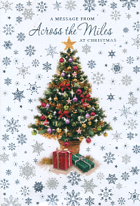 Across the Miles Christmas card with a beautifully decorated Christmas tree on the front design. The Christmas tree is surrounded by silver snow flakes and the design is finished with silver foil writing and detail. Inside the card there is a colour print with a printed Christmas message. This card comes with a red envelope.