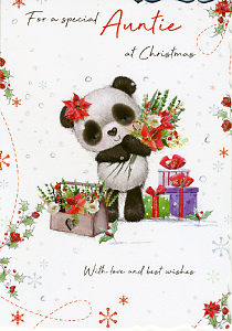 Send love to a special Auntie this Christmas with this cute and delightful Auntie Christmas Card. The front design has an illustration of a panda holding a Christmas bouquet with more flowers and gifts around them. The design is finished with glitter detail and the edges of the card are shaped. Inside the card has a colour print insert with a printed Christmas message. This card comes with a red envelope.