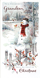 Send festive cheer and love this Christmas to your Grandson with this Grandson Christmas card. This Grandson Christmas card has a delightful illustration on the front of a happy snowman and their robin friend in a snowy garden. The front design is finished with red and silver foil writing and silver foil detail giving that special Christmas sparkle! Inside has a short printed Christmas message and this card comes with a gold pearlescent envelope.